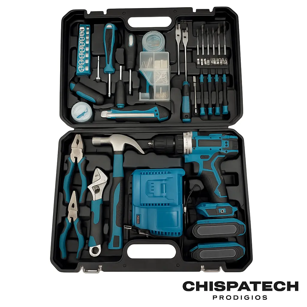 Taladro + 2 baterías + cargador rápido + 9 dados + 6 brocas + 10 copas de destornillador + martillo + sierra manual + destornilladores variados + herramientas de precisión + cinta métrica, alicates, llave inglesa y más.