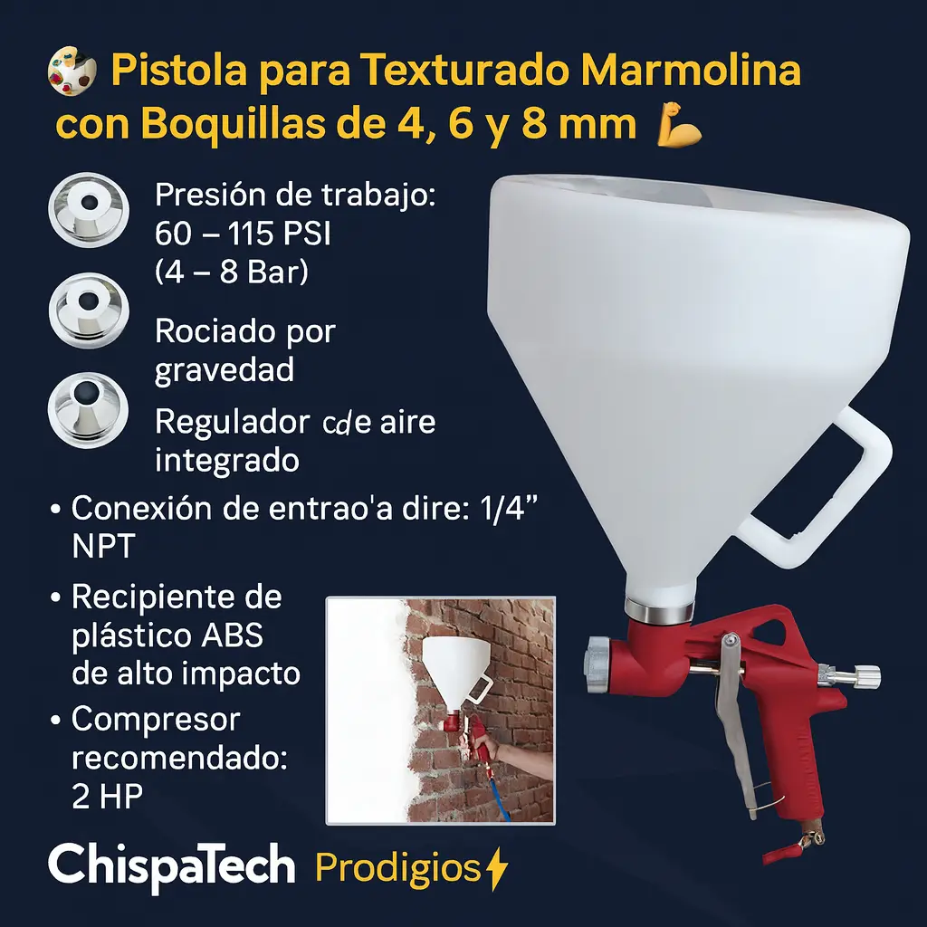 Aplica texturas decorativas con precisión y eficiencia con esta pistola profesional para marmolina y acabados texturizados.